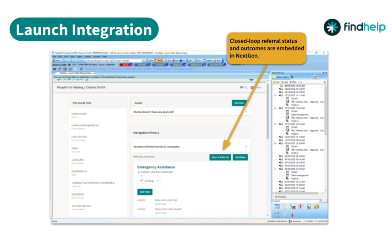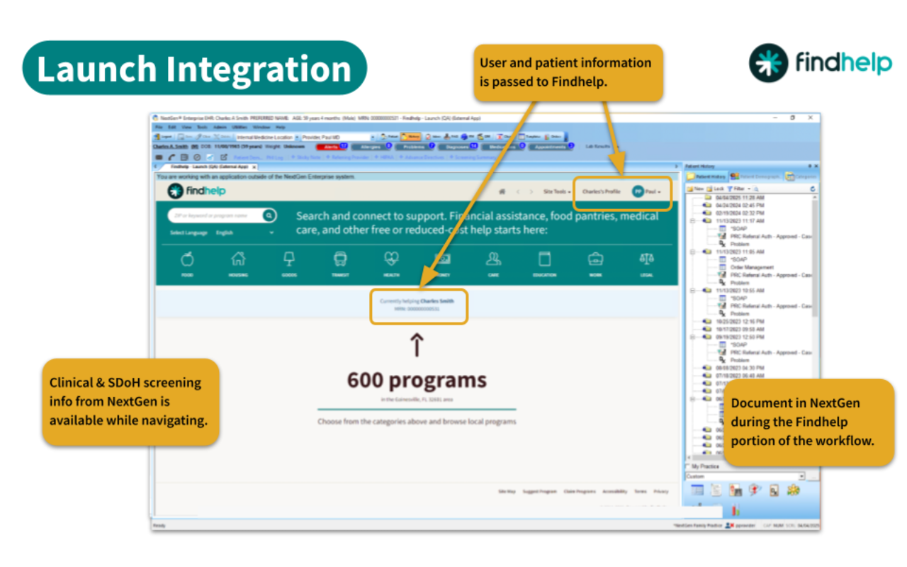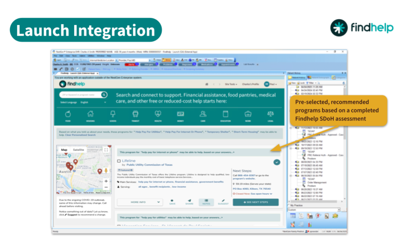 With one click, staff can launch the Findhelp platform directly from within NextGen. Users will be automatically signed in to Findhelp and brought to a page that is tailored to the patient they are assisting. Patient demographic information from NextGen will be brought over to autofill referral or assessment forms, if applicable.
