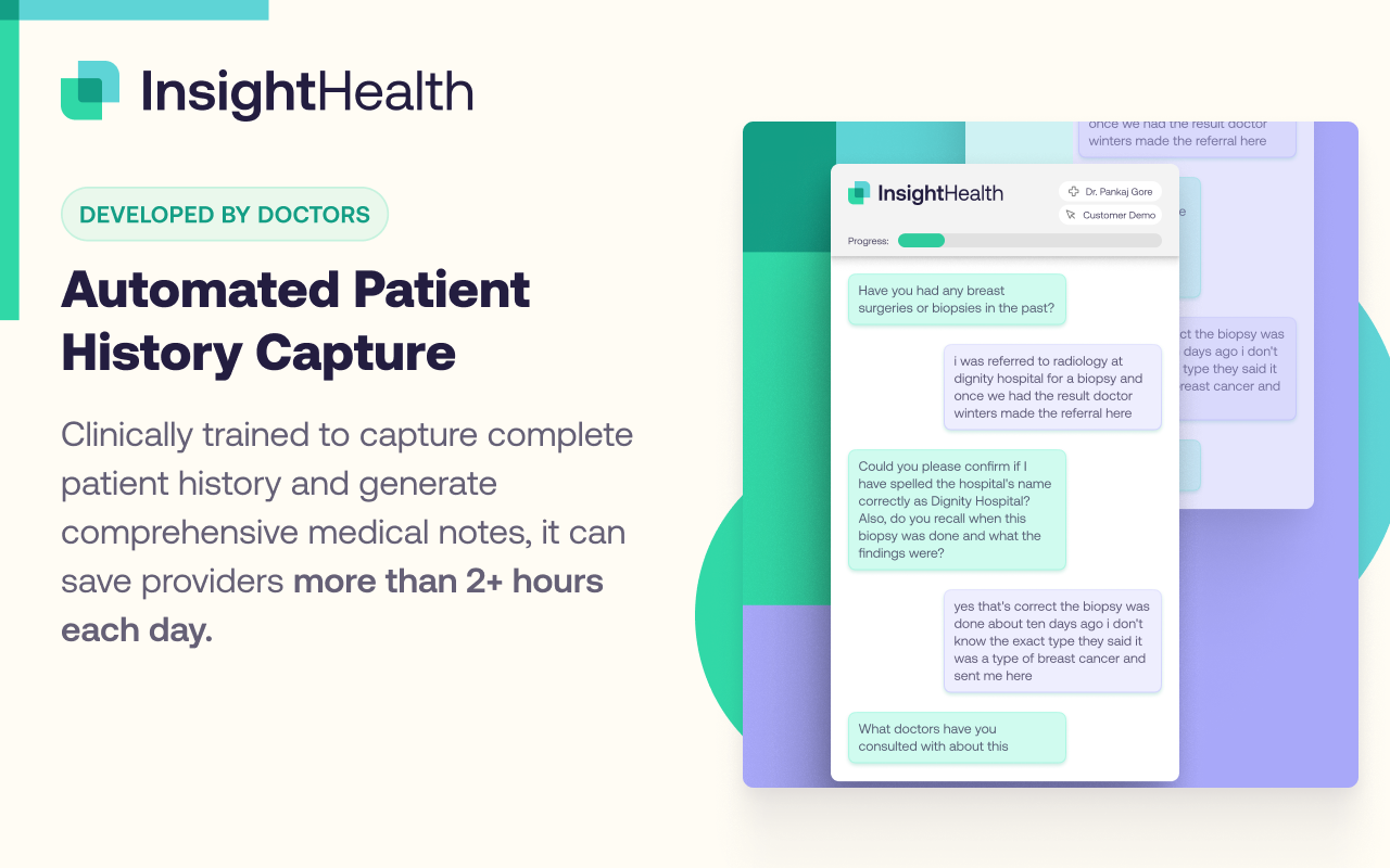 Insight Health's AI Virtual Care Agent (VCA) extends patient care beyond the clinic walls, automating routine tasks while maintaining personalized care. Developed by doctors, our AI clinician agents meet with patients independently before and after visits, capturing comprehensive medical histories and managing follow-ups through natural conversation. The VCA streamlines workflows, increases practice efficiency, and improves patient satisfaction—all while saving clinicians more than 2 hours daily.