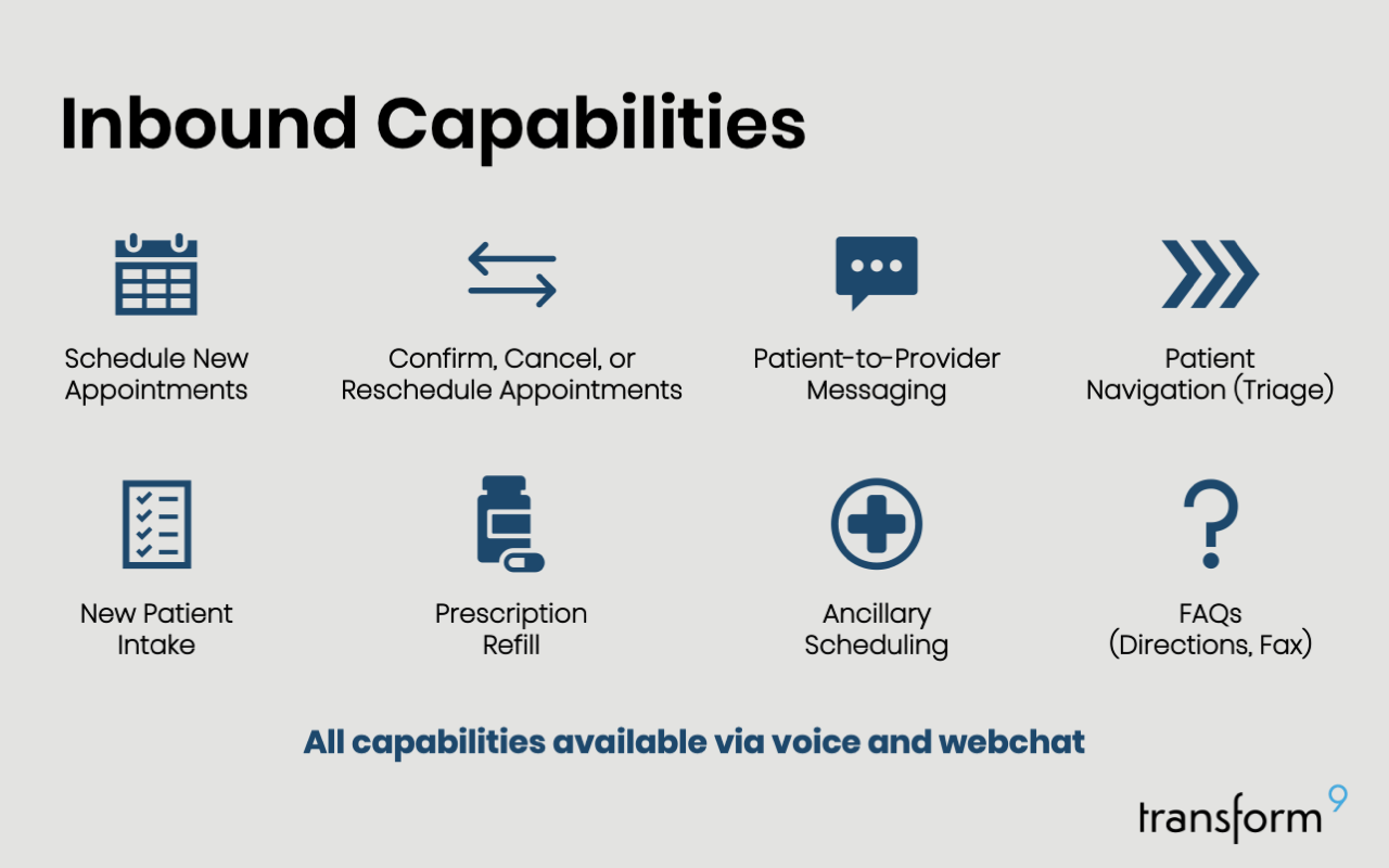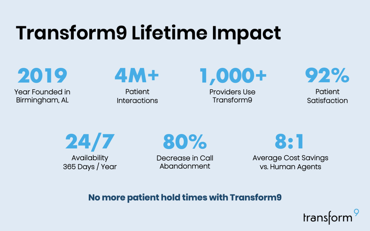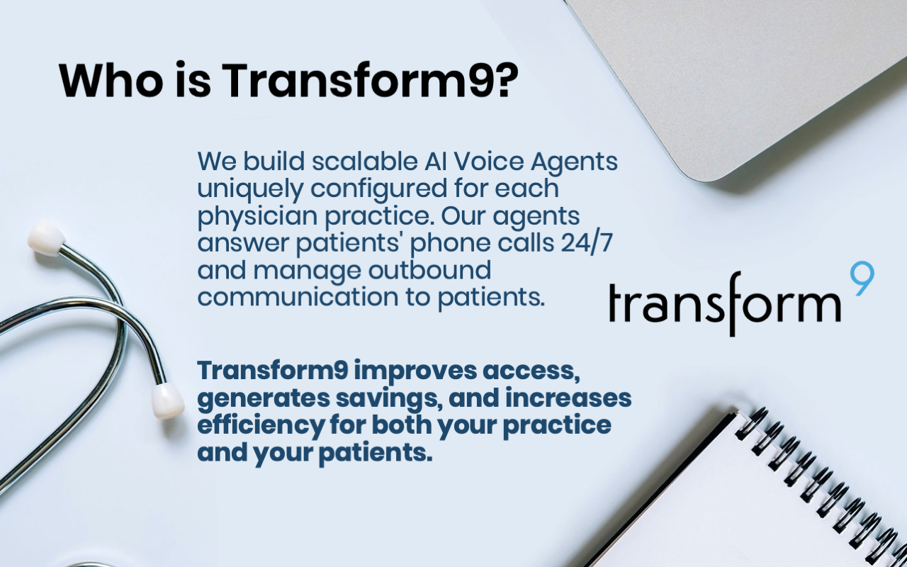 Transform9 is the next-generation AI solution for physician practices looking to automate patient calls, reduce costs, and improve operational efficiency. Schedule a demo today to see how our AI agents can revolutionize your practice.