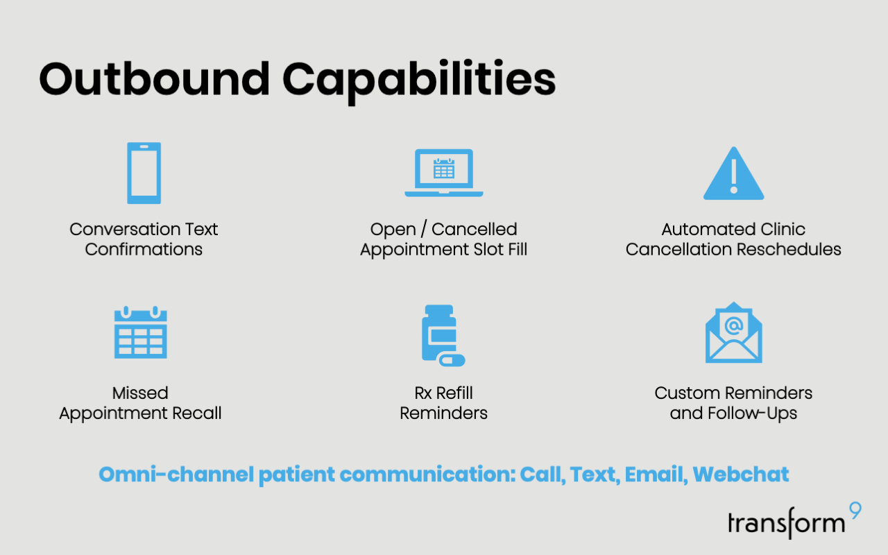 Transform9’s generative or traditional AI voice agents seamlessly integrate with NextGen to answer patient telephone calls 24/7. Designed uniquely for each physician practice, our AI agents intelligently resolve inbound and outbound calls, allowing staff to focus on high-value patient interactions instead of repetitive administrative work.